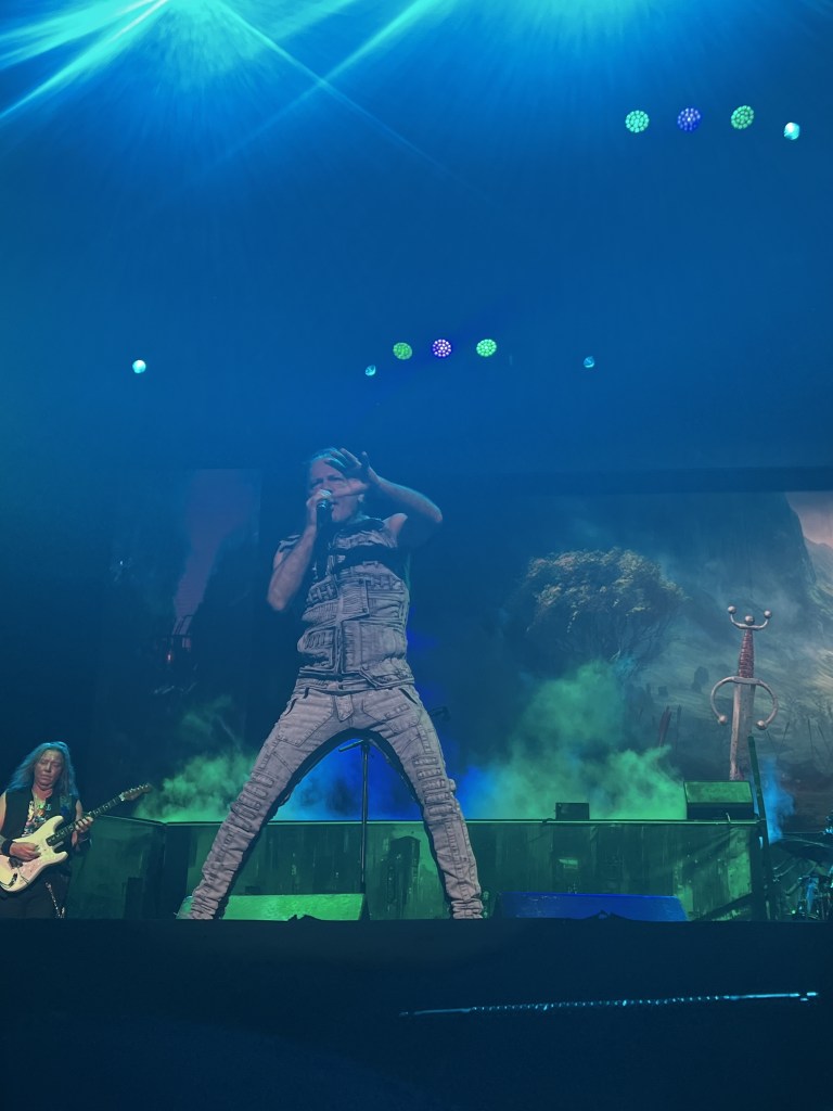 Desde el momento en que las luces se apagaron, el ambiente estuvo cargado de emoción. La multitud comenzó a aclamar a la espera de la llegada de la banda, y cuando Bruce Dickinson, con su inconfundible energía, apareció en el escenario, el Movistar Arena estalló en ovaciones. La banda comenzó con un poderoso tema como «Caught Somewhere in Time», lo que hizo que los asistentes se entregaran de inmediato al poder de la música.